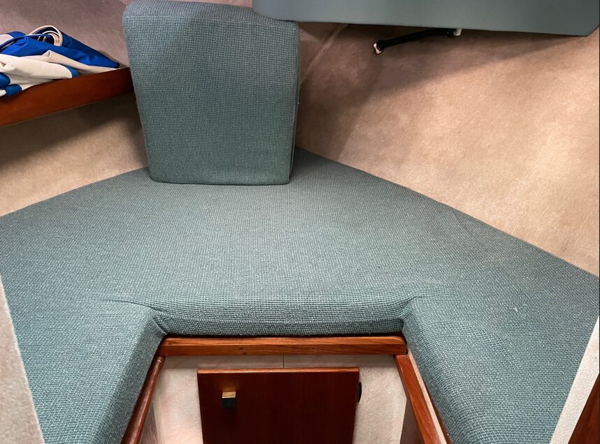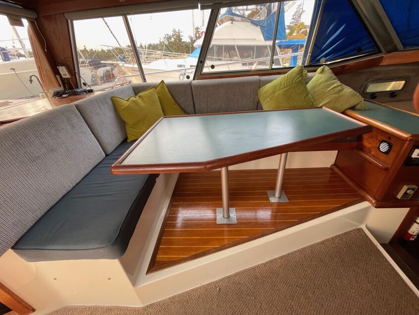 ACCOMMODATIONS You enter the salon via a sliding door from the cockpit. Immediately to port is the entry down to the Master stateroom which features a king size bed which extends under the salon floor, plus a closet and vanity. Forward of the master entry is a large L-shaped convertible dinette with a large dining table and a beautiful teak and holly floor. To starboard is the lower helm and helm chair. The U-shaped galley is down two stairs on the port side and opposite is the head/shower combo. The private guest stateroom features a vee-berth in the forepeak which converts to a Vee-double with a filler cushion.>