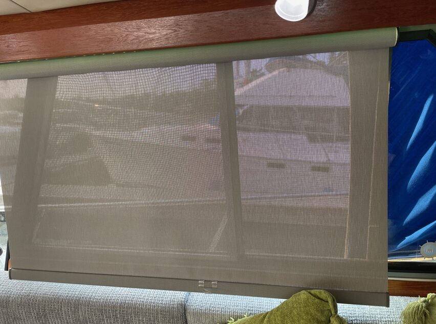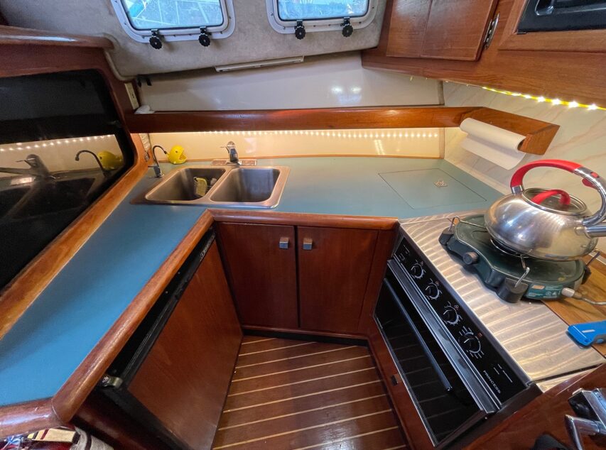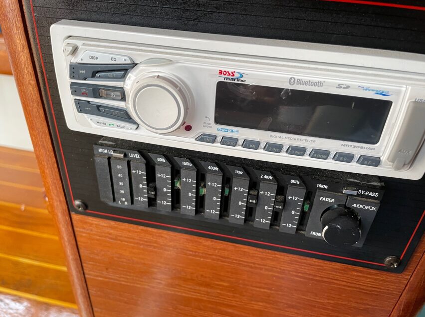 GALLEY & INTERIOR Lighting is LED and incandescent lighting / Custom blinds for the windows in Salon area / Espar forced air furnace / 3 burner - 120 Volt Princess cook top / Sanyo Microwave oven / Norcold dual voltage refrigeration / 11 USG hot water tank / Boss Stereo with Blu Tooth / Graphic equalizer>