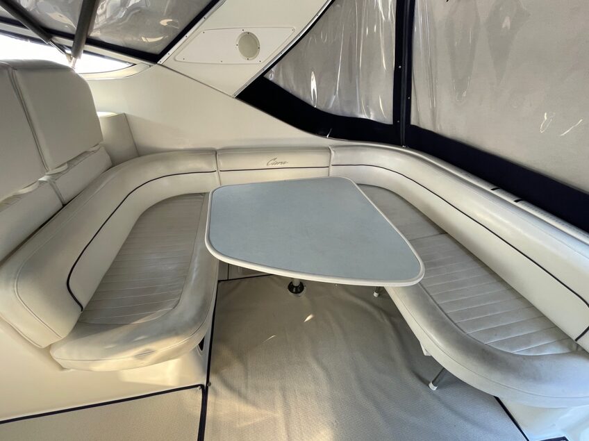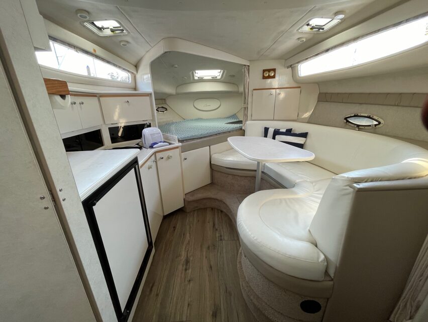 DESCRIPTION This Bayliner 3055 Ciera exhibits all the traits that made them popular! The width of this model is substantial for her length which means that there is more space in the cockpit and the cabin. This extra space allows for a layout which will comfortably accommodate eight of your friends and family for day boating trips out on the water whilst sleeping four at opposite ends of the boat. The spacious layout means that there is also a permanent u-shaped dinette that doesn't need to be converted into a bed each night unless you have an extra couple on board. The port side galley features a cooktop, sink, microwave oven and under bench fridge/freezer to cater for your entertaining and meals. When down below, you will also notice the generous amount of natural light that filters through the large windows and the free flow of air throughout the space. This contributes to the sense of roominess as much as the width and layout do, this is noted on the length of beds, plus plenty of head height . The dual helm seat allows a friend or family member to sit alongside the skipper. On the opposite side, there's a second seat for another co-navigator! The Bayliner 3055 Ciera is one of the most advanced sun cruisers in its class, delivering performance, comfort, style and value. The interior of the 3055 offers a large mid cabin berth, a forward offset double berth, and a dinette that converts to a double, plus a full galley and a separate enclosed head. Full Galley equipped with Microwave, Stove & Fridge, Powered by MerCruiser 5.7 Litre 250HP. Headroom is excellent in this boat-nearly six-and-a-half feet. In the cockpit a U-Shaped lounge features a removable table and converts to a sun pad. A wet-bar/entertainment centre is to port, and a transom door opens to the integral swim platform with its swim ladder & built in shower!>