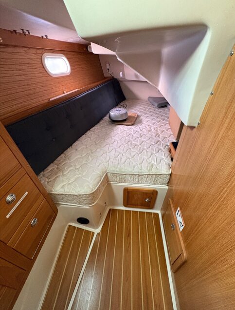 AFT STATEROOM Queen aft berth with upgraded mattress / Two portlights / Two Lewmar hatches / Hanging locker / Three built in drawers / Stand up changing area>