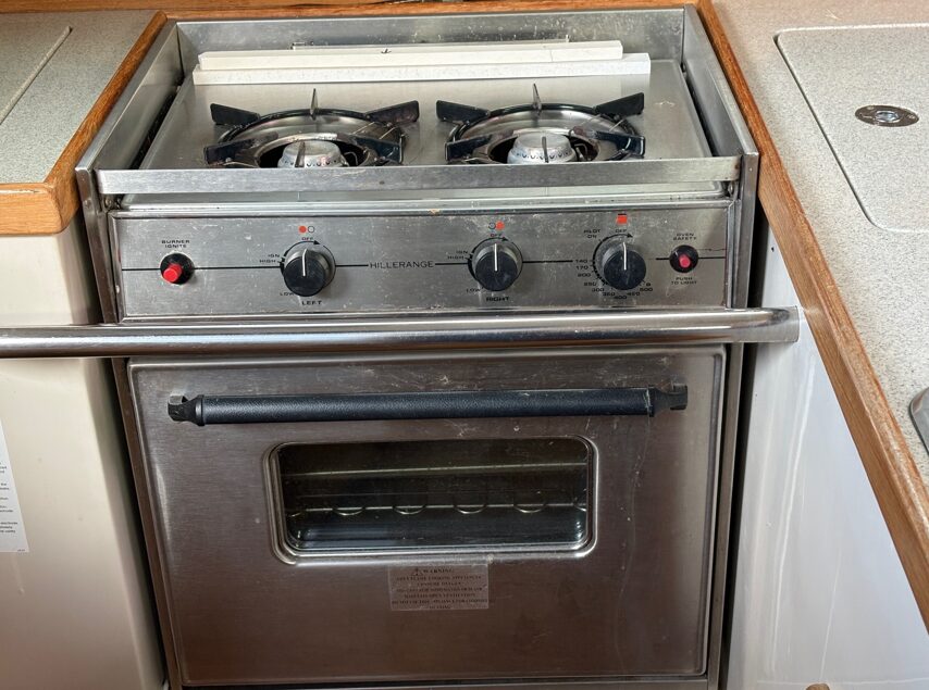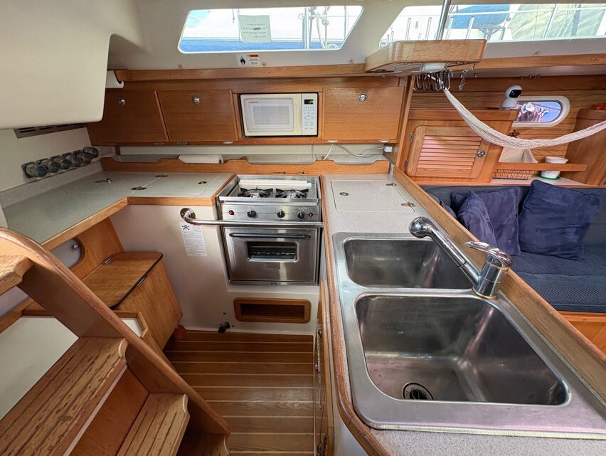 GALLEY Hillerange 2 burner propane stove with oven / Tappan microwave / Adler Barbour cold plate refrigeration / Foot operated refrigeration sump pump / Hot/cold pressure water / Single lever faucet / Double stainless sinks / Ample storage>