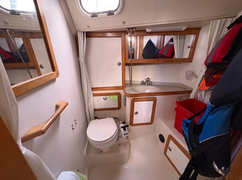 HEAD Manual marine head / Sanitation hoses replaced 2025 / Shower, shower seat and shower curtain / Hot/cold pressure water / Electric sump pump / Overhead lighting / Lewmar hatch / Vanity / Y-Valve>