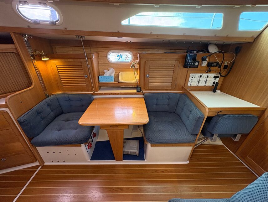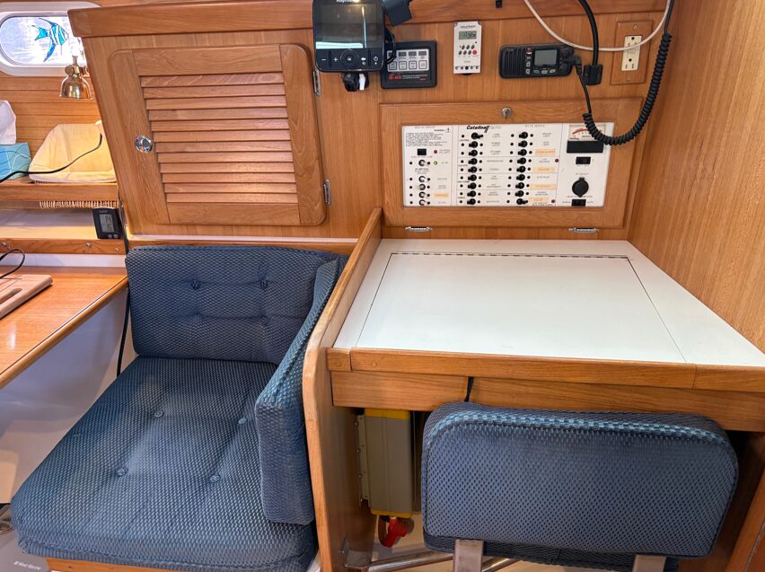 NAVIGATION STATION Standard Horizon VHF radio / Dragonfly / 110v outlet / Chart table with swing out seat / Chart table light>